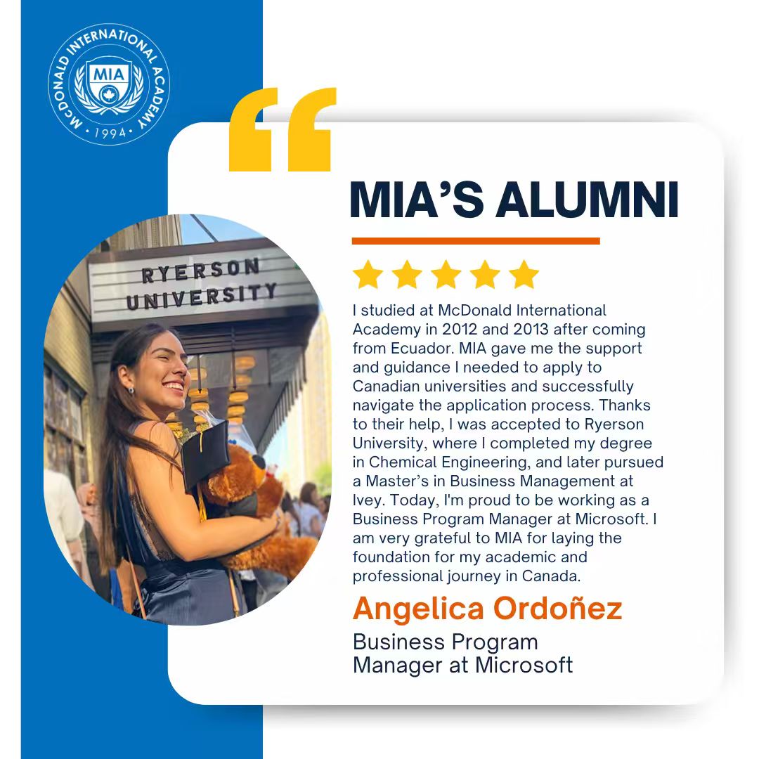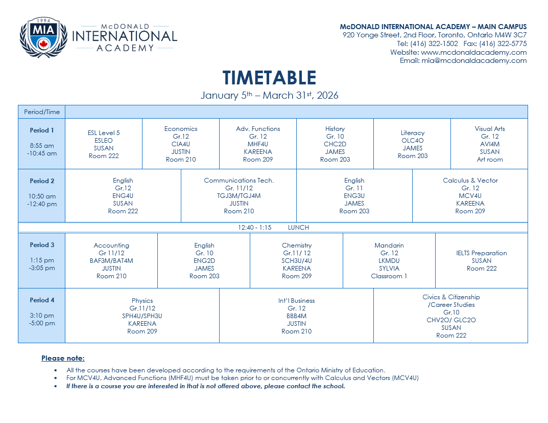 Established in 1994, McDonald International Academy (MIA) is a fully registered and accredited secondary school inspected by the Ontario Ministry of Education.